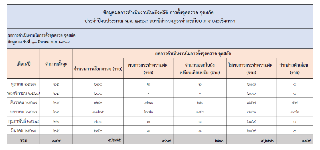 สถิติการตั้งจุดตรวจ จุดสกัด ของสถานีตำรวจภูธรท่าตะเกียบ